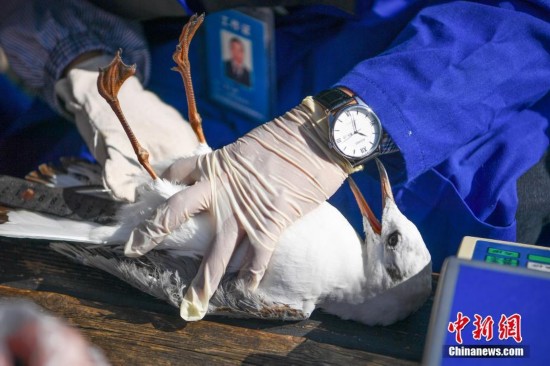 工作人員介紹,環志的目的在於了解紅嘴鷗種群數量變化情況及身體狀況,更好地為候鳥遷徙研究和野生動物疫源疫病監測工作服務。中新社記者 劉冉陽 攝