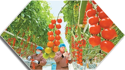 甘肅省張掖市甘州區採用先進農業技術,建成10多萬平方米現代農業智能溫室工業化蔬菜栽培車間。圖為甘州區三和智慧農業產業園蔬菜栽培車間裡,工人在採摘成熟的“串番茄”。 |