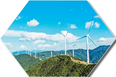 湖南省永州市藍山縣十裡沖風電場,一台台風電機組聳立在連綿的青山之上。 |