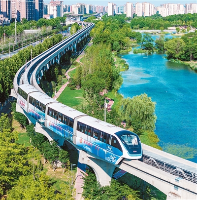 近年來,安徽省蕪湖市通過軌道交通與公交、慢行系統的深度融合,助力市民高效便捷出行,推動城市功能升級與低碳轉型。圖為無人駕駛單軌列車行駛在軌道上。 |