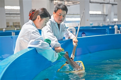 湖北宜昌,三峽大壩一側,佔地5萬多平方米的長江珍稀魚類保育中心內,一條條長約20厘米的黑色魚苗在養殖池內歡快地擺動尾巴。科研人員仔細檢查智能溫控系統運行狀態,逐池監測記錄各項水質指標。