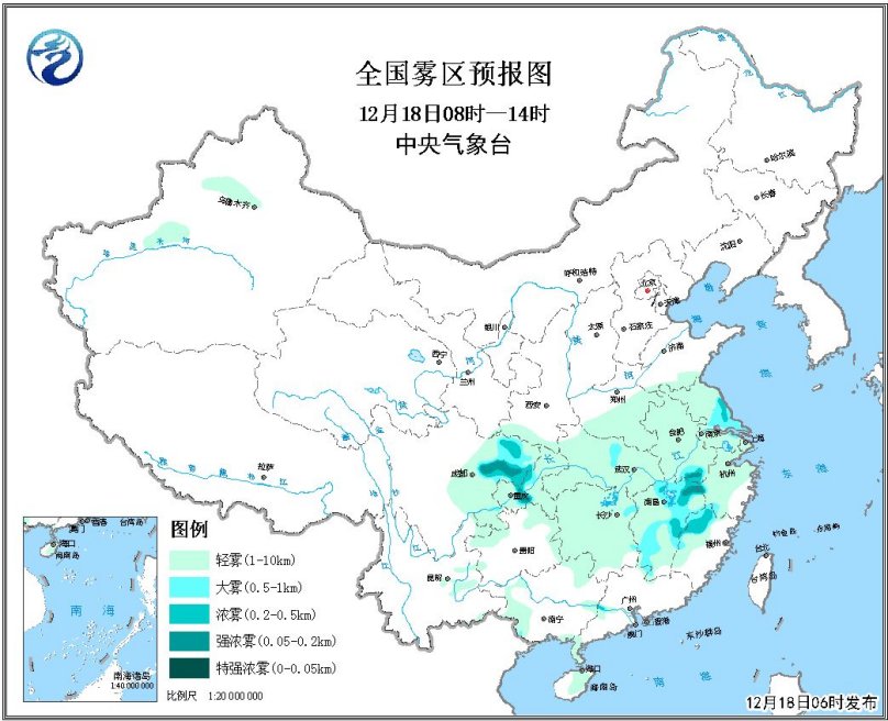 此外,12月18日早间至上午,江苏中部、江西中东部和西南部、福建西部、四川盆地中东部等地有大雾,其中,江西东部、福建西北部、四川中北部、重庆中部地区有浓雾,部分地区有能见度不足200米的强浓雾。中央气象台12月18日06时继续发布大雾预报。