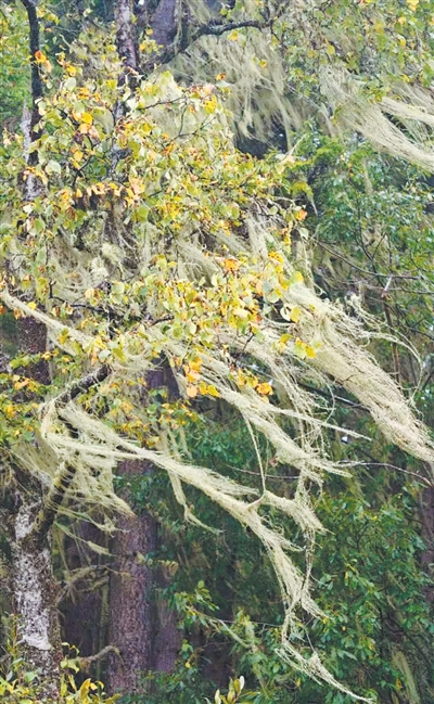 “那是‘树胡子’!”向导王国仙说,“它是藻类和真菌的共生体,枝状地衣的一种。”